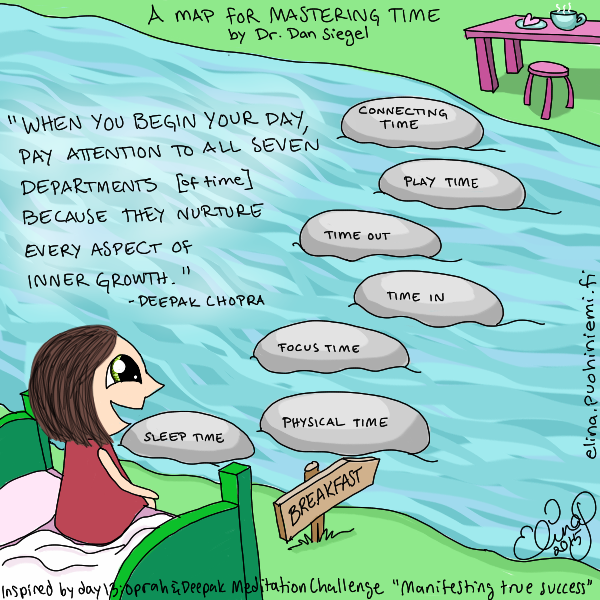 A Map for Mastering Time by elinap | Mar 31, 2015 | Yleinen | 2 comments “Dr. Dan Siegelin ajanhallinnan teoria ‘Kun aloitat päiväsi, kiinnitä huomiota kaikkiin seitsemään ajan osa-alueeseen, sillä ne yhdessä hoitavat jokaista sisäisen kasvun piirrettä.’ ” Deepak Chopra’s and Oprah’s 21 Day Meditation Challenge 2 Comments elinap on 1.4.2015 at 4:10 PM Loistavaa!! <3 Visuaalinen juurruttaa uudet asiat tehokkaasti käytäntöön – minullakin 🙂 Katja - Tässä ja Nyt on 31.3.2015 at 9:40 PM Tänään kuuntelin tätä ja ajattelin että tästä pitäisi tehdä jokin lappu seinälle 🙂
