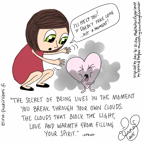 Break Through Your Clouds by elinap | Aug 4, 2015 | Yleinen “Olemisen salaisuus piilee hetkessä, jona puhkaisee oman pilvipeitteensä. Pilvipeitteen, joka estää valon, rakkauden ja lämmön täyttämästä sielua. – Oprah – [Mira sanoo] ‘Minä autan sinua! Ei kestä enää kauan ..Vain pieni hetki!’ ” 21 day Meditation Challenge by Deepak & Oprah