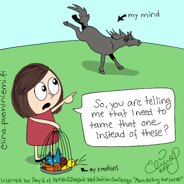 Let Your Emotions Fly Free by elinap | Mar 21, 2015 | Yleinen | 2 comments “[Hevonen] Minun mieleni [Lintuhäkissä] Minun tunteeni ‘Eli sinä koitat sanoa, että minun tarvitsee kesyttää tuo näiden sijaan?’ “ Deepak Chopra’s and Oprah’s 21 Day Meditation Challenge 2 Comments elinap on 22.3.2015 at 11:13 PM Kiitos, Katja! <3 <3 <3 Katja - Tässä ja Nyt on 22.3.2015 at 6:00 PM Nämä on niin ihania 🙂 <3