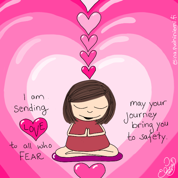 Tuhannet ja miljoonat ihmiset etsivät parhaillaan turvallisuutta. Osasta tulee pakolaisia, osa taistelee. Ja osa, ikävä kyllä, ahdistuu heistä, jotka etsivät turvaa. Heitä kaikkia yhdistää pelko. He kaikki ovat peloissaan turvallisuutensa puolesta. Ensimmäinen asia, mikä tuli mieleeni, mitä itse voin tehdä, on lähettää rakkautta kaikille pakolaisille, kaikille, jotka sotivat ja kaikille sosiaalisen median öykkäreille. Unohtamatta tietenkään itseäni, jotta voin olla avuksi ja vajoamatta pelon alle itse.