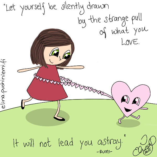 The Strange Pull Of What You Love by elinap | Aug 14, 2015 | Yleinen No just, suomennos ei nyt ihan taivu kauniiseen runolliseen muotoon.. Ideana se, että anna sen, mitä rakastat, hiljalleen ohjata sinua. Se ei johda sinua harhaan. – Rumi –