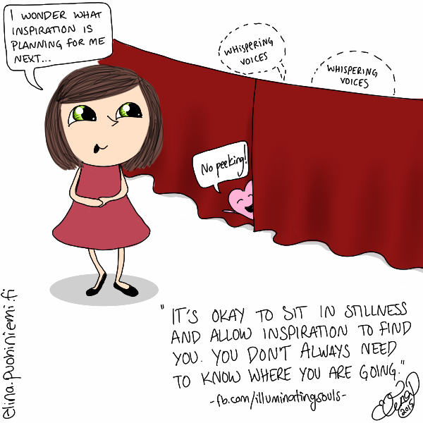 What Is Your Inspiration Planning? by elinap | Sep 8, 2015 | Yleinen “[Mira] ‘Mitähän inspiraatio suunnittelee minulle seuraavaksi..’ [Verhon takana] Kuiskailua [Sydän] ‘Ei kurkita!’ ‘On ookoo istua hiljaisuudessa ja sallia inspiraation löytää sinut. Aina ei tarvitse tietää, mihin on menossa.’ “ Illuminating Souls